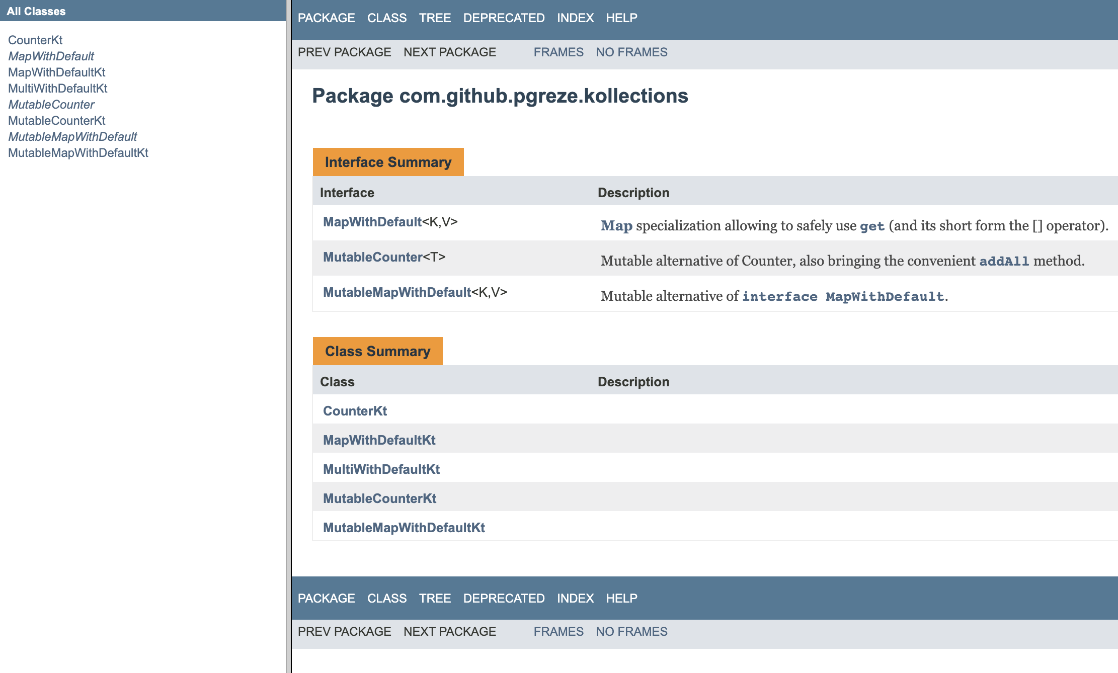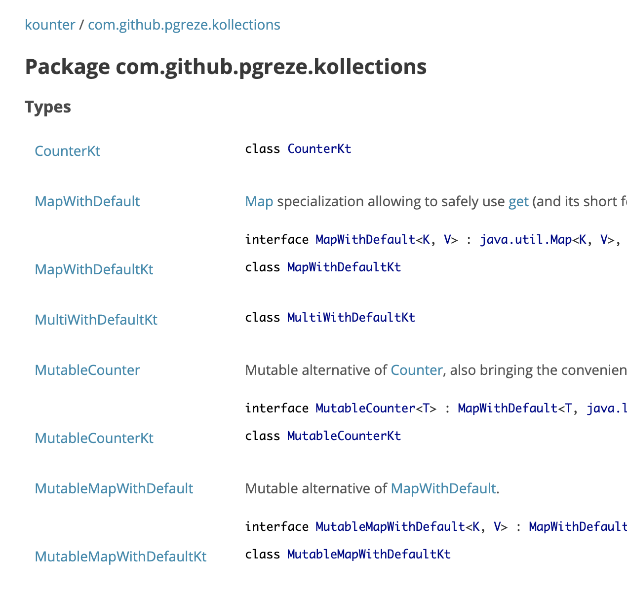 $ open build/dokka/kounter/index.html # Open in your browser (OSX)